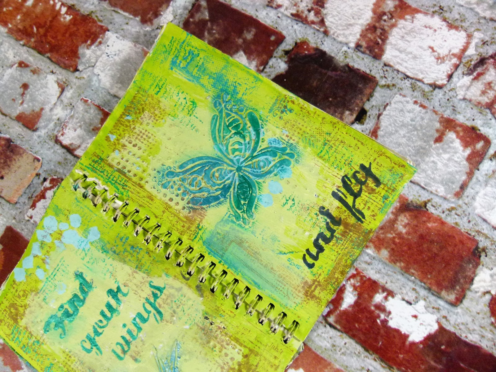 i started off by covering both pages with white gesso. This covers up any marks on the pages and stops inks soaking through. I then choose three shades of green for the background which are Early Spring Green, Citrus Green and Ocean Green. I painted the pale color over the pages and then while it was drying i went over the edged with Citrus and Ocean green.